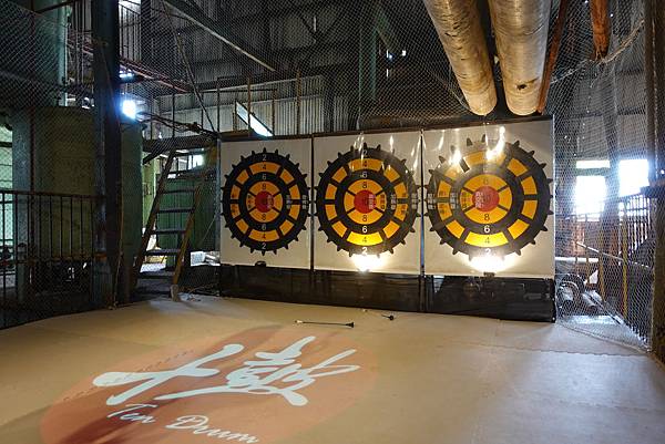 夢糖工廠內2F有親子射箭區,這是小妹年齡可以玩的,不過只有例假日下午開放,這區沒有冷氣,又在車間內部,很熱很熱,我看見工作人員桌上擺了一大罐冰塊水,我想,這缺真是難賺。